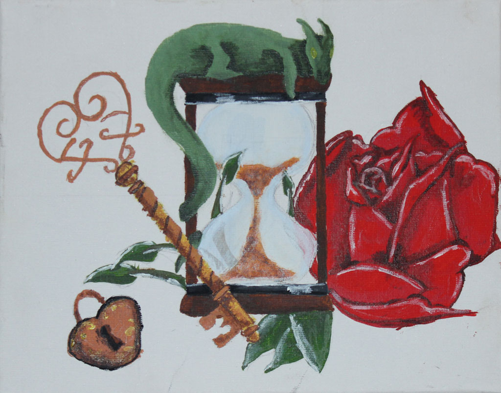 This painting represents the ticking time that goes past while you wait for you love one to appear in your life. The key is ready to open the locket, the hour glass and the rose represents the time frame of someone’s life waiting for a loved one, and the dragon is you.